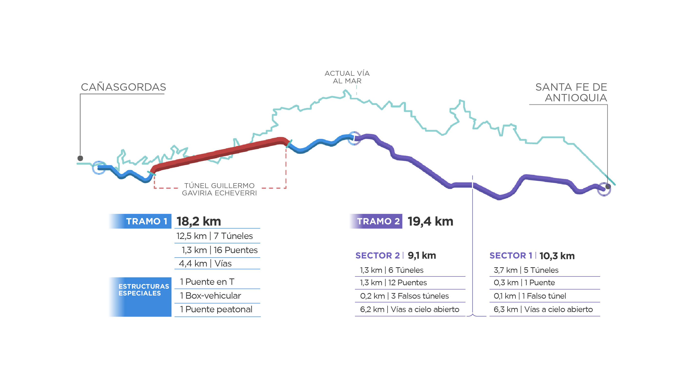 La totalidad del proyecto tiene una longitud aproximada de 39.5 kilómetros de vía nueva, su diseño permitirá alcanzar una velocidad de 80 kilómetros por hora, permitiendo una disminución en tiempos de recorrido hacia Urabá desde Medellín en 4.5 horas; el proyecto será un referente para la ingeniería por tener el túnel vial de mayor longitud en Latinoamérica.
